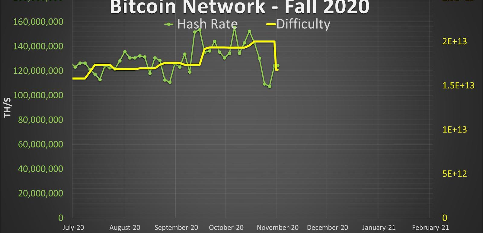 2019年秋季的降幅没有2018年那么大,但确实出现了一些重大的难度下调及哈希率的下降。此外,在同一时间段内网络哈希算力的增长也出现了类似的阻碍。