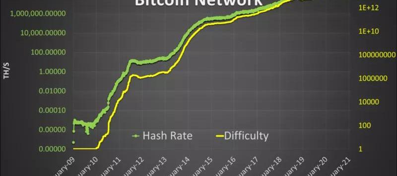 虽然在线性图上我们可以清楚地看到难度的下降,但是在上面的对数图中,哈希率和难度的下降则并不明显。在比特币网络的历史上,区块难度通常呈上升趋势,难度降低的情况很少。这在一定程度上是由于挖矿设备的能效的提高所致。