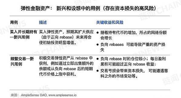 需要注意的是,并非所有 rebase 资产都是承担稳定币职能。许多观察人士将所有 rebase 资产都划到稳定币类别里,这是不准确和不正确的。不同的弹性代币都寻求在不同的时间段内实现稳定性。算法稳定币(使用 rebase 机制实现约等于 1 美元或与其他法定货币的价格紧密锚定)只是其中一种弹性资产。还存在其他弹性资产,如下表所示。