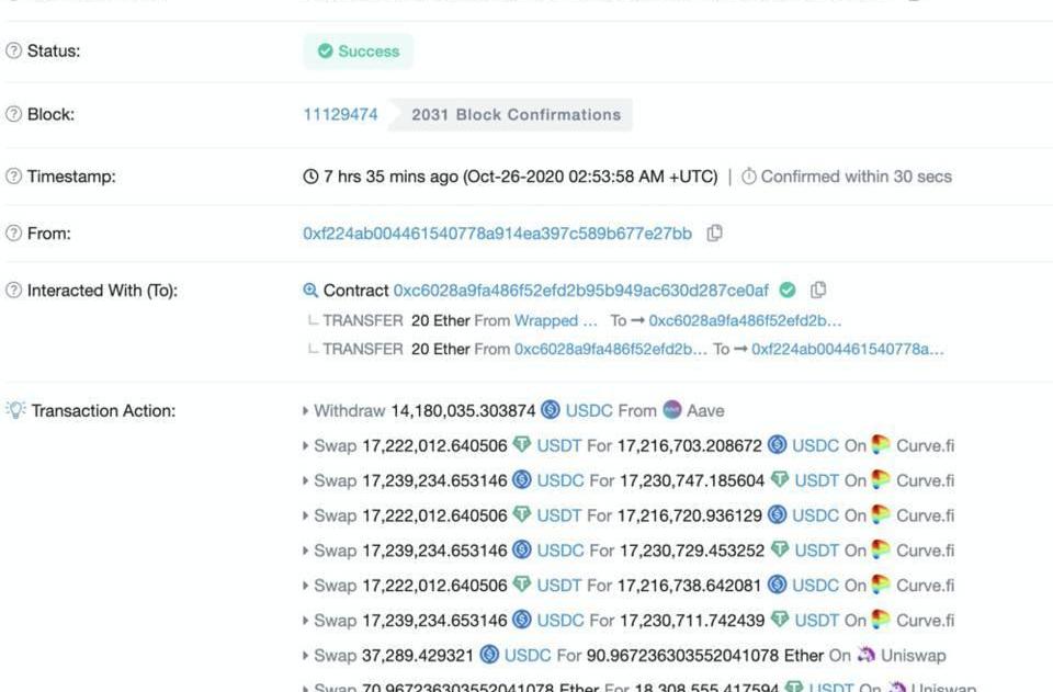 10月26日中午12时左右,DeFi热门项目HarvestFinance被曝遭黑客攻击。据推特网友发现,疑似有黑客借用闪电贷,使用20ETH从HarvestFinance中套现超400万美元。