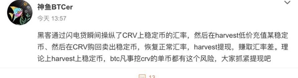 由于本次安全事件涉及的金额较大,且影响较广,再次引发市场对DeFi项目安全性的担忧。Cobo联合创始人神鱼在微博表示,理论上凡是Harvest上的稳定币和BTC挖CRV的单币都有这个风险,大家抓紧提现。