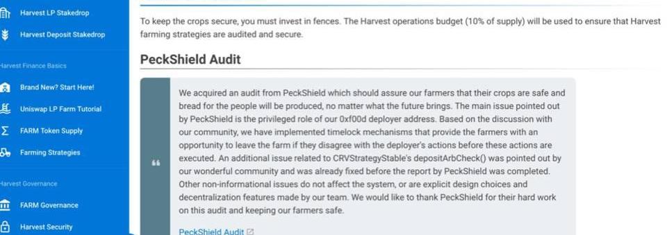 在攻击发生前,DeFi分析师ChrisBlec揭露了HarvestFinance存在的巨大风险。其指出,HarvestFinance拥有一个管理密钥,可让持有者随意铸造代币并窃取用户的资金。正如该项目的审计公司PeckShield和Haechi所指出的那样,其治理参数不是由具有明确定义规则的合约来设置的。该管理密钥可能由该项目背后的匿名开发者持有。持有人可铸造无限数量的代币,并消耗代币的Uniswap池中的资金。