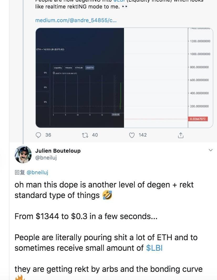 “人们现在正在进入LBI,在我看来,这就像即时的坠毁模式……代币价格在几秒钟内从1344美元跌至0.3美元,人们实际上是在倾倒大量ETH,然后有时收到少量的LBI,他们因为联合曲线而惨遭损失。”