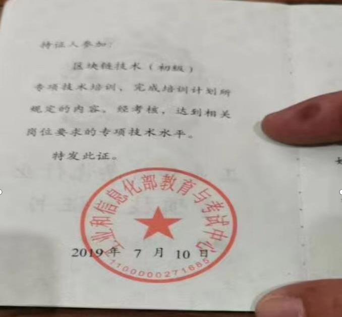 记者了解到,上述国金公链员工所说的“工信部初级证书”,是指区块链技术专项技术培训,完成培训和考核后,获得由工信部教育与考试中心盖章的“专项技术证书”。