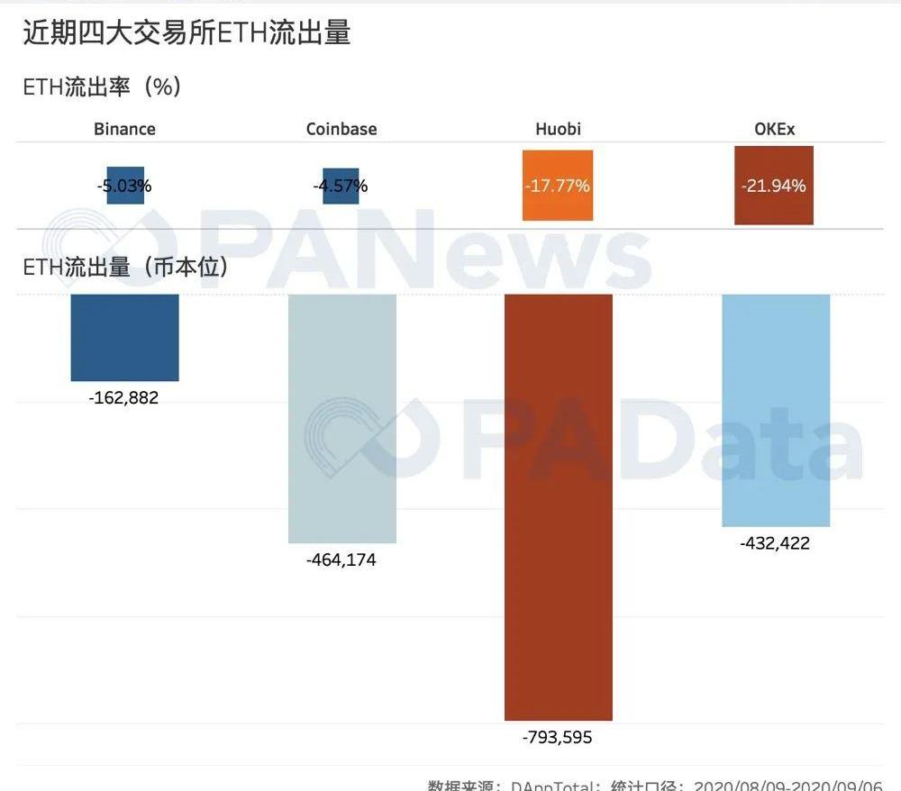 由于目前的DeFi生态主要都部署于Ethereum上,因此ETH成了DeFi的基础资产,观察ETH的流动方向在一定程度上能展现DeFi的发展态势。根据DAppTotal的统计,Coinbase、Binance、Huobi和OKEx这四大主要交易市场,最近一个月都在流出ETH,总计达到了185.31万枚ETH。按照CoinMetrics校正后的8月ETH均价401.85美元来折算,相当于四大所近期共流出了7.45亿美元。
