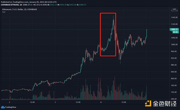 吊诡的是,在ETH信托溢价暴跌的同时,ETH的价格却再度涨上了1100美元大关。