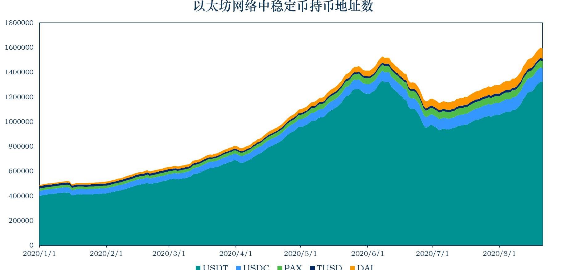 USDT、TUSD、DAI的持币地址数分别上升90845个、504个、1695个,USDC、PAX的持币地址数分别下降2375个、12个。