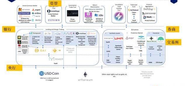 另外就是钱包和券商,就是交易所,以及预言机和。预言机是提供数据接口,让现实世界发生的数据连到Defi的金融产品中;