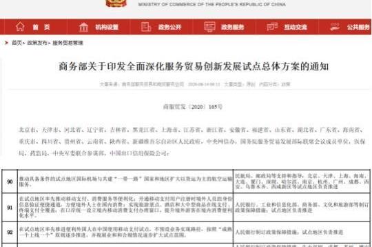 2020年8月14日,商务部网站刊发《商务部关于印发全面深化服务贸易创新发展试点总体方案的通知》,通知明确,在京津冀、长三角、粤港澳大湾区及中西部具备条件的试点地区开展数字人民币试点。