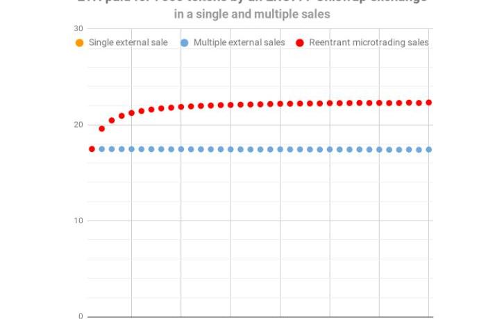 每个点代表固定销售数量Uniswap支付的ETH。例如,在20个“重入攻击”中每个售出350个token,使用重入微交易攻击产生大约22.192ETH,而正常条件下通过外部调用tokenToEthSwapInput函数20次,一共出售7000个token,则利润仅为17.44ETH。?随着调用次数的增加,重入攻击中显示出的利润有着明显的差异。合法的正常交易产生大约17.418ETH的收益,而重入微交易攻击产生约22.324ETH的收入。随着时间的推移,蓝色虚线并不是恒定的,有一个较小的斜率。