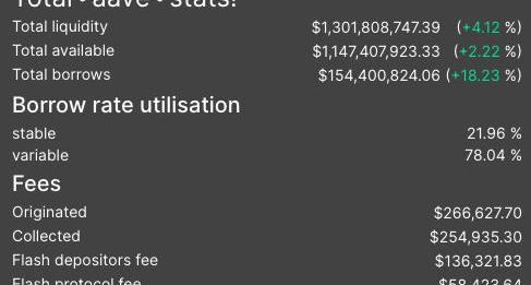 但是,Aave的供应量为13亿美元,活跃借款为1.54亿美元,可供借款人使用的差额为11.5亿美元。