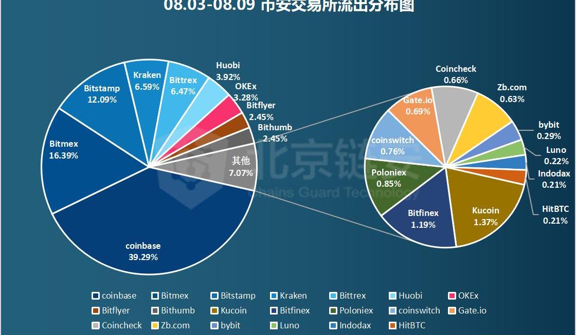 在过去一周,交易所之间的比特币来往又呈现怎样的分布呢?我们将币安、火币、OKEx三大交易所流出到各交易所的比例在这里也向各位呈现。