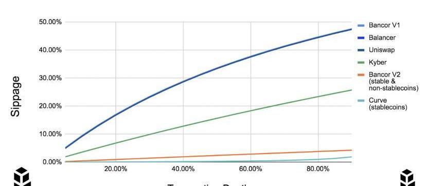拥有100,000美元储备的AMM将在10,000美元交易中产生10%的滑点。但是,如果引入Bancor20倍放大,则同一笔交易的滑点将减少到1%。