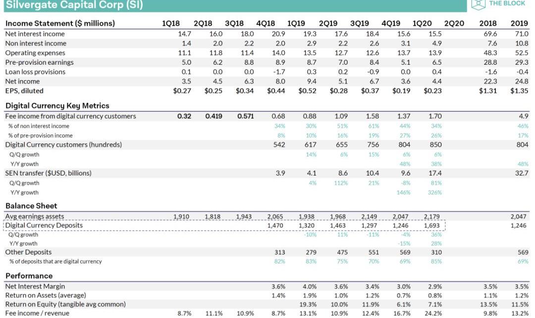 OCC的公开信以及摩根大通等银行向加密交易所提供银行服务的举动是否会影响银门发展无息存款的能力呢?通常情况下,获得银行的无息存款是很难的。然而对于加密货币友好的银行来说,并非一直如此,因为难以找到银行合作伙伴,导致加密货币相关企业会去接受较低的存款利率。但随着OCC的最新举措,这种情况是否会结束呢?考虑到2020年第1季度Silvergate85%的存款来自数字货币客户,目前还不清楚大型商业银行越来越多地接受去服务加密货币公司是否会影响到这个不计息的存款基础。对Silvergate来说的一个积极点是,存款基础是通过"零成本"的方式获得的,数字资产客户必须在Silvergate发布和维护存款,以使用它的实时全天支付网络SEN。值得注意的是,SignatureBank在2季度报告了自己基于区块链的支付平台Signet带来了价值2亿美元的存款增长,由于历史交易量过大,该公司首次将这些数字列出来,这很可能预示着Silvergate2季度会有来自SEN的存款增长。