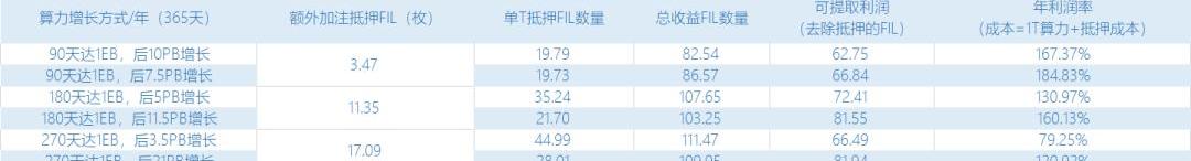 184.83%为最高年利润。90日天达1EB、后来每日7.5PB算力增长的年利润最高为184.83%,单T抵押数量最少约为19.73枚FIL,即是成本也是最少;