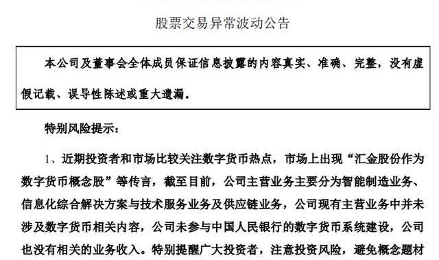 与此同时,一些被外界认定为是“数字货币概念”的上市公司,则纷纷为股民降温。近日,汇金股份、众应互联等纷纷发布公告,称并未参与央行数字货币开发。