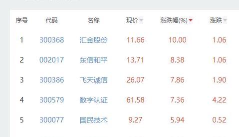 从个股看,汇金股份涨停,东信和平、飞天诚信、数字认证等多股涨逾6%。