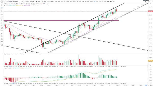 近期高点再次被刷新,价格保持向上试探,最高接近10500美元一线,遭到上方阻力压制在小幅回落,成交量依旧没有放量,也是短线未能延续涨势的原因,日线指标上依旧保持强势,价格仍位于一个上升通道内运行,从趋势看很明显多头占据优势,整体呈现一个震荡上行的姿态,上方第一阻力区在前期13900美元下来的61.8%点位11000美元附近,不过目前小时线在形成一个楔形整理,短线回落的可能性大,只要不破趋势支撑,回踩就是加仓做多的机会,后市仍有空间,支撑10000-10100美元区域。