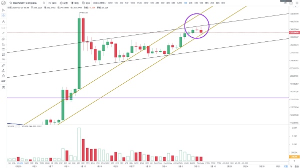 目前价格已破位5日线支撑,不过仍处于上升通道内,有效跌破345美元支撑,才能打破通道支撑,那么将会向10日线寻求支撑,成交量依旧缩量,直接跌破大幅下探得可能性不大,短线延续弱势整理得概率大些,目前仍处于三角末端收敛,一旦突破顺势跟进即可。