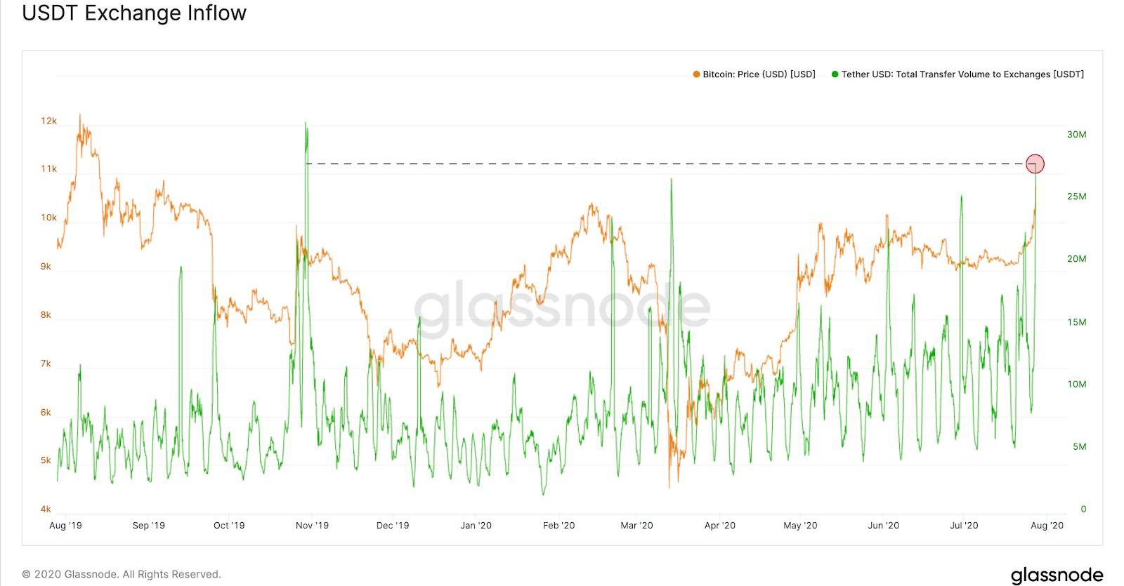 根据链上数据提供商Glassnode的数据,Tether的交易所流入量最近飙升至过去8个月来的最高水平。昨天,随着比特币飙升至10,270美元,USDT的交易所流入量达到2020年的高点,然而,自那以后比特币一直在继续上涨,目前价格为1.1万美元。