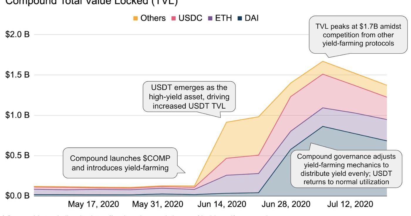 流动性挖矿推动了资本的大量涌入Compound——在6月中旬的一周内,将近十亿美元进入Compound中,使其锁定总价值从1亿美元增至高峰时的超过17亿美元。COMP同样以80美元左右的价格开盘,并暴涨至最高300美元以上。