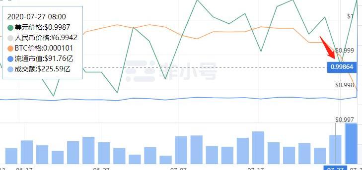 与美元挂钩的USDT价格也下跌不少,一度跌破7.0。