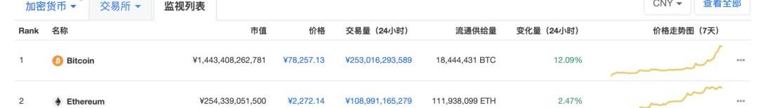 但根据CMC数据,整个加密货币市场63%由比特币主导,而以太坊市值只占11%。比特币市值是以太坊的约6倍。