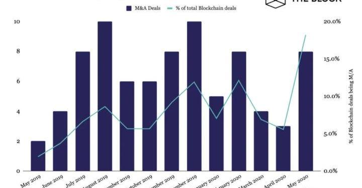目前的经济环境对于兼并和收购来说是成熟的。五月份公司的兼并和收购占了18%的投资交易金额。二月份公司的兼并和收购的占比也相当高,占了所有区块链交易的12%。这两个月是2020年兼并收购交易最高的两个月。