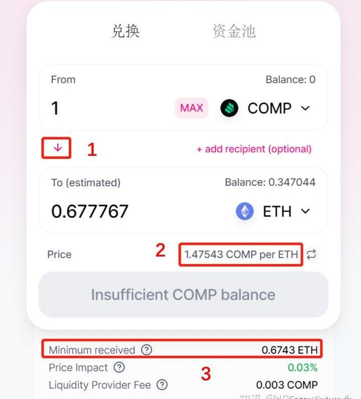 第一个红框是切换交易对,系统默认ETH在上,我将其切换到ETH在下,我想兑换的Comp在上;第二个红框是Comp/ETH的价格,第三个红框是Uniswap预计兑换后最少你能获得多少币。