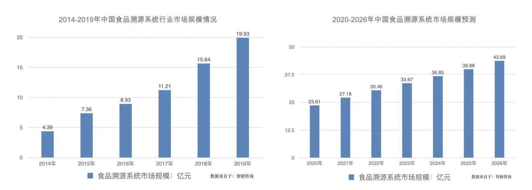 2014年我国食品溯源系统行业市场规模4.39亿元,到2019年增长到了19.93亿元。