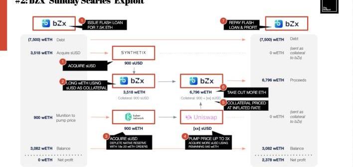 比如在今年2月15日的bZx的两次攻击事件中,第一次攻击使用了5个DeFi协议,第二次攻击使用了4个DeFi协议。两次攻击都是在一个15秒的以太坊区块中完成,两次攻击耗费118.21美元的手续费,共获利价值92万美金的以太坊。