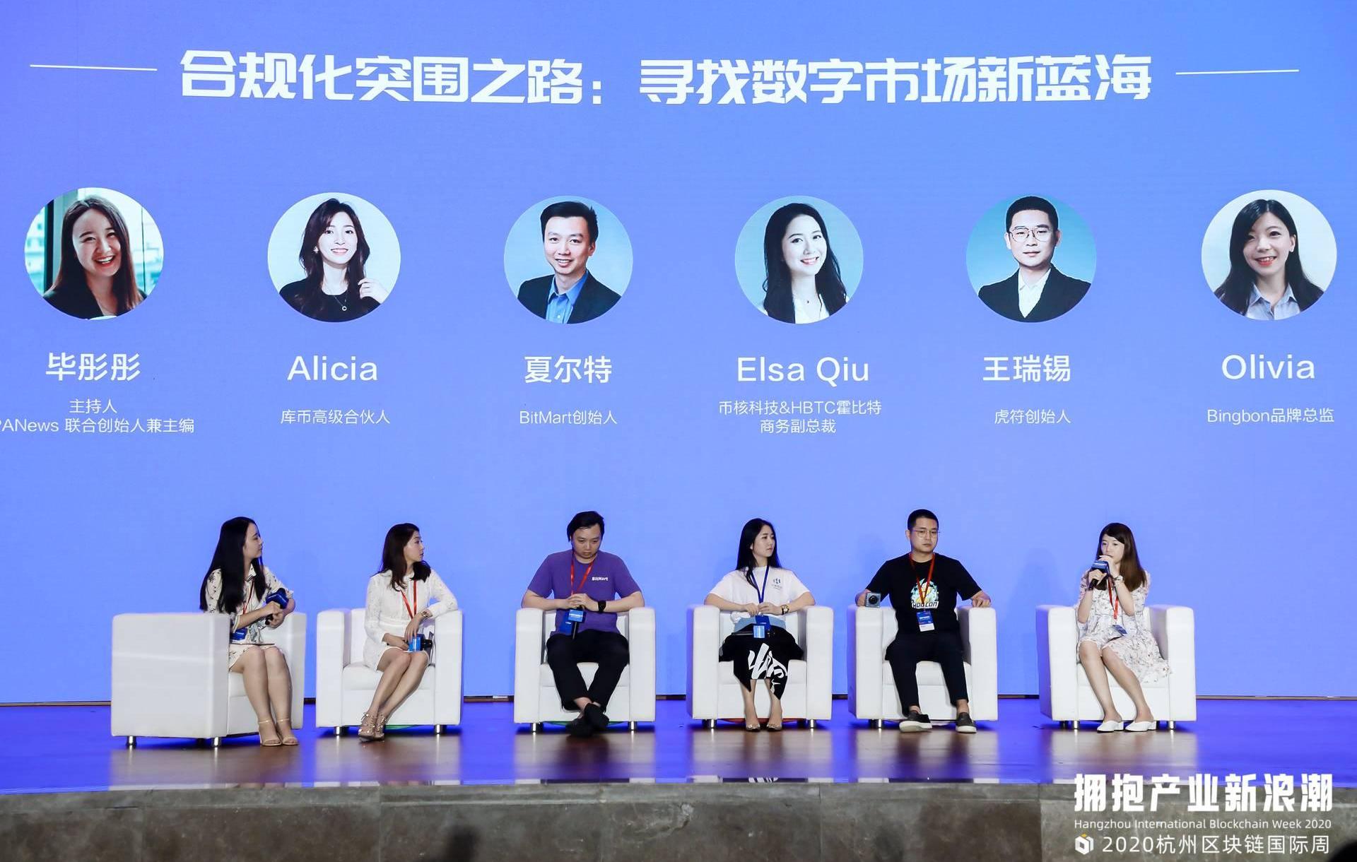 7月5日,由杭州市余杭区政府指导,杭州未来科技城管委会、巴比特主办的“2020杭州区块链国际周”正式开幕。在《合规化突围之路:寻找数字市场新蓝海》圆桌上,库币高级合伙人Alicia、BitMart创始人夏尔特、币核科技&HBTC霍比特商务副总裁ElsaQiu、虎符创始人王瑞锡与Bingbon品牌总监Olivia,与主持人PANews联合创始人兼主编毕彤彤一起,探讨了数字货币交易市场的挑战与机遇。