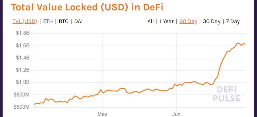 这轮DeFi的大热,归功于COMP,把DeFi的市值从20亿美金,推向了60亿美金。DeFi中的锁仓也推向新的台阶。如下图,为DeFi的锁仓总价值,从曲线上看,开始进入阶段性平稳期。
