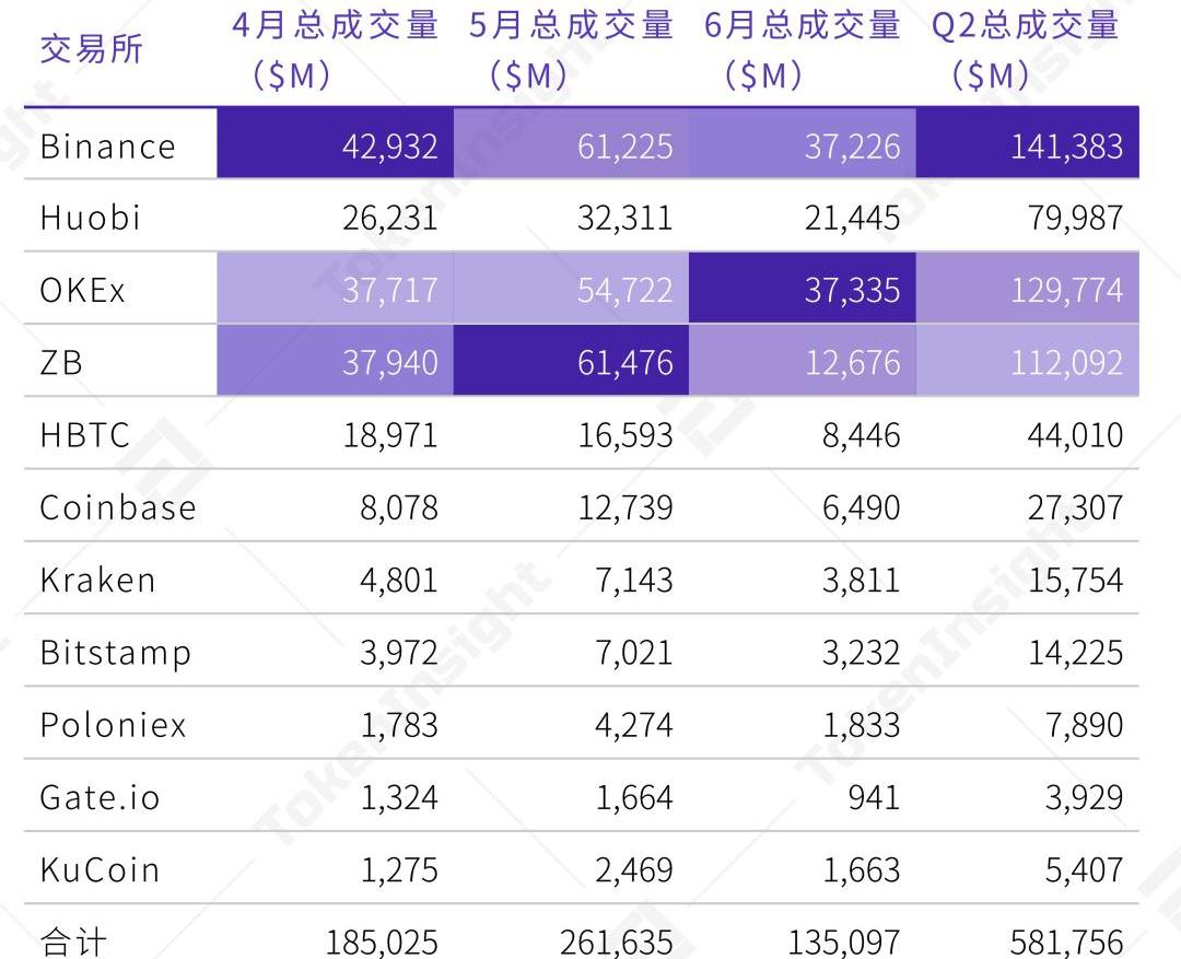 20Q2重点交易所逐月成交量表现,来源:TokenInsight