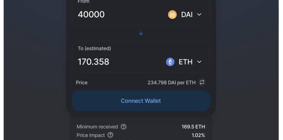另一方面,以目前资金体量计算,4万DAI兑换相应数量的ETH会产生约1%的滑点。
