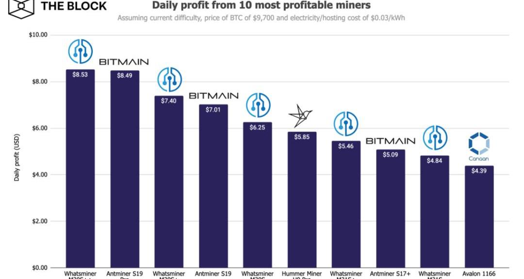 5月20日,数字资产研究机构TheBlock的最新报告显示,比特币网络奖励减半后,最赚钱的矿机是比特微生产的神马M30S++,“可以产生高达112TH/S的哈希率,以每天8.53美元的利润排名第一。”比特大陆的蚂蚁S19Pro可产生的哈希率为110TH/S,日利润为8.49美元。值得注意的是,最受欢迎的上一代矿机蚂蚁S9现在几乎没有盈利,每天仅产生0.52美元的利润。
