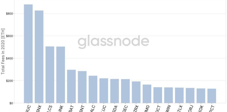 如图6所示,2020年消耗费用最多的ERC20代币中,位居榜首的为WUC,SNX,LCS,LINK和BAT。