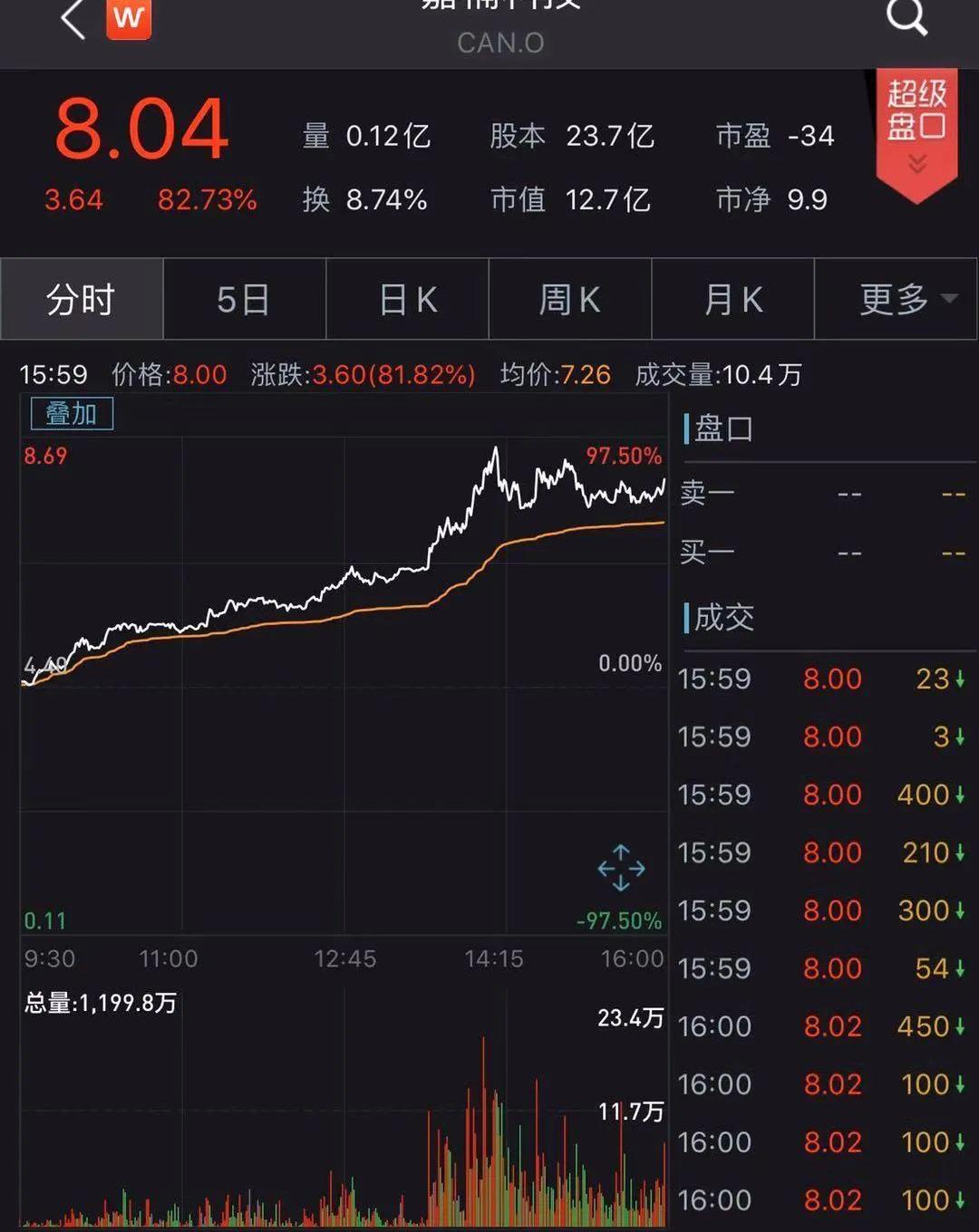 2月12日,嘉楠科技股价突然飙涨,盘中一度上涨97.5%,接近翻倍,最终以8.04美元/收盘,涨幅82.73%,全天成交量1200万,是上市首日时的3倍。
