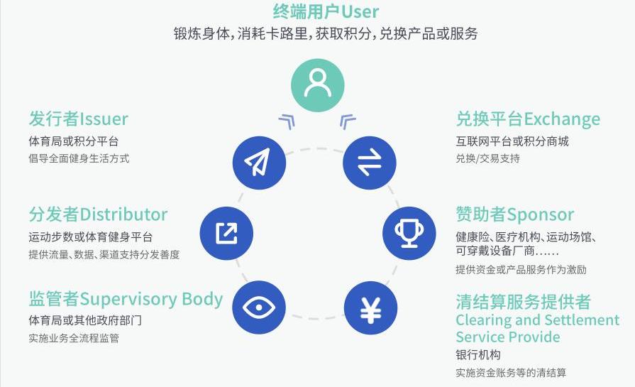 在获得用户授权的前提下,通过5G、IOT等先进技术记录其每次运动的卡路里等数据,进而获取积分来兑换奖品与服务。体育总局等政府部门担任“善度”的发行者与监管者,倡导健康的生活方式的同时,实施业务全流程监管;体育健身平台担任“善度”分发者,提供流量、数据、渠道支持;善度赞助者由健康险、医疗机构、运动场馆、可穿戴设备厂商等担任,提供资金或产品服务作为激励;善度兑换平台可由互联网平台或积分商城承担,所有兑换记录上链存储;善度清结算服务提供者可由持牌银行机构承担。