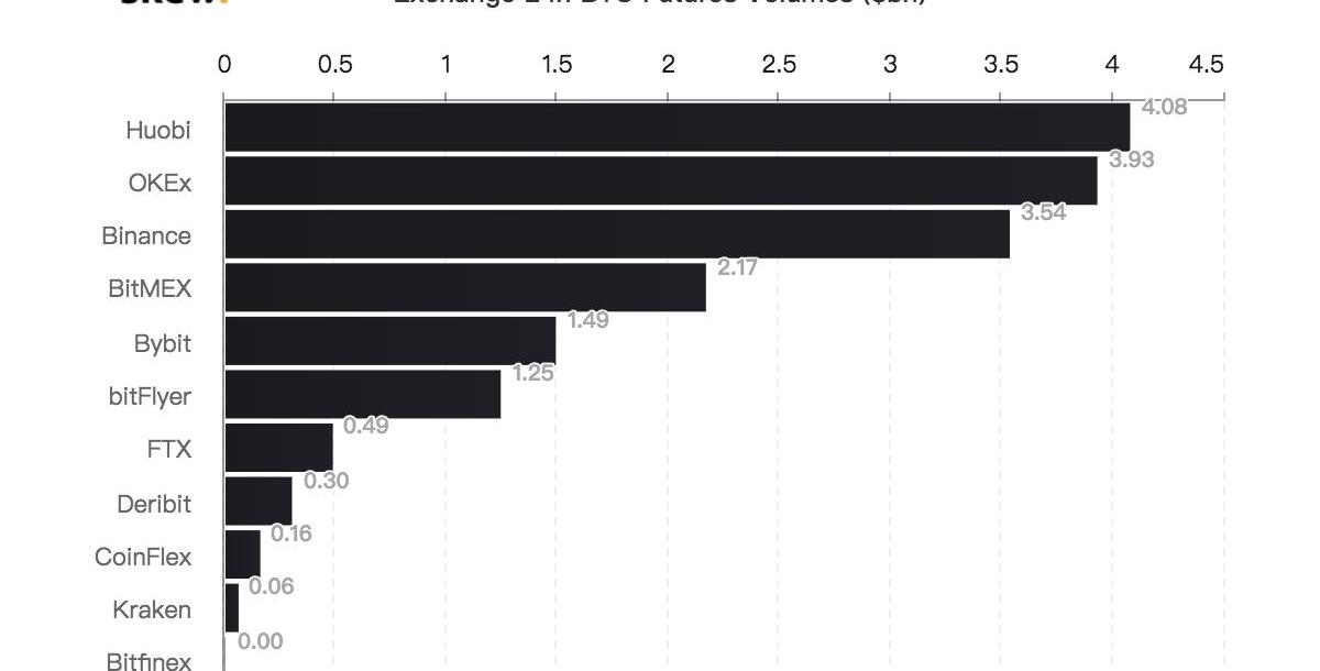 根据加密货币衍生品分析公司Skew的最新数据,交易所24HBTC合约交易量排名中,BitMEX仅位列第四位,被火币、OKEx和币安甩在身后,还有更多的合约平台厮杀进来抢夺市场。