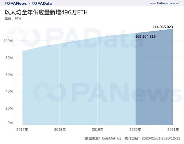 截至12月31日,ETH的总供应量约为1.14亿枚,较年初新增了约496万枚。