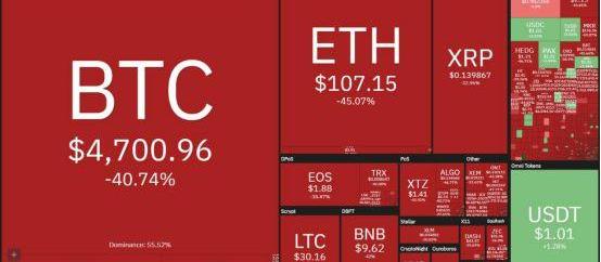北京时间2020年3月12日晚间六点开始,比特币经历了颇为壮观的血洗之夜,价格如同泄洪一般,接连跌破7000美元、6000美元、5000美元关口。到了3月13日早间,各大平台比特币价格均跌至4800美元下方,24小时跌幅高达40%,创2019年4月以来新低。