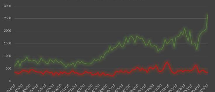 散户持仓方面,多头头寸自2071张大幅上涨至2645张,空头头寸自346张微降至345张。散户在相当一段时间的克制状况终于出现变化,最新统计周期内散户多头头寸大幅增持,强势刷新历史高点位置,与此同时空头头寸的调整非常有限,散户在最新统计周期内给出了一个相当强烈的看涨态度。一则可以认为是散户的反应仍然明显慢于市场波动,二则也可以理解为行情出现回调后散户开始寻求「补票上车」机会,散户的FOMO情绪已有开始蔓延的迹象出现。