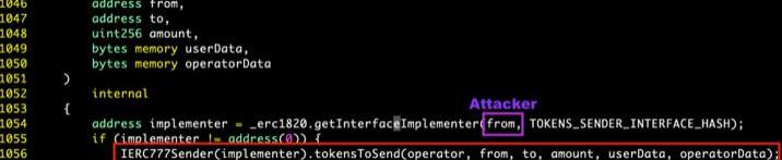 其中最关键的部分是,攻击者可以通过注册from的tokensToSend()?来实行回调。我们从下面的代码片段可以看到,ERC777标准中可以通过getInterfaceImplementer()获得攻击者的tokensToSend()接口,并在第1,056行调用此函数。而此处正是黑客劫持交易实施攻击的入口。