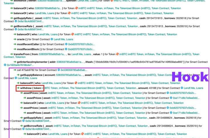 在Uniswap遭攻击约24小时后,又一DeFi平台Lendf.Me也遭到了黑客攻击。下面是其中一个攻击交易的截图。如图所示,