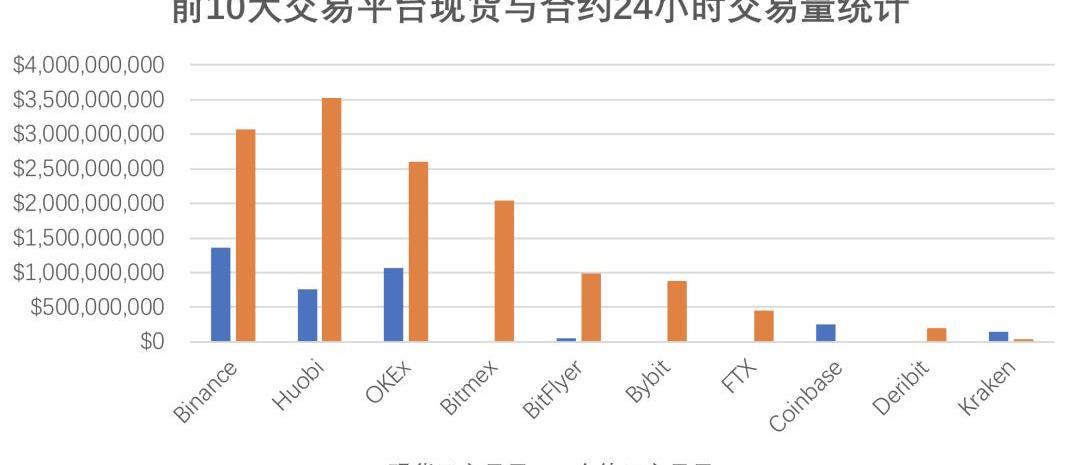 数字资产交易领域,经过了2017年ICO热潮的褪去,以及多种金融创新,逐渐形成了合约交易为主,现货交易为辅的新市场形态。根据CoinGecko最近的统计数据,综合交易量排名前10的交易平台中,平均合约日交易量达到了现货日交易量的3.8倍。其中,火币合约以每日35亿美元的交易量一直名列前茅。