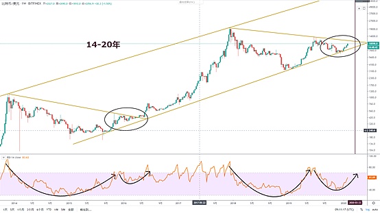 再来看下,比特币2014-2020年6年的长期历史走势,整体运行在一个大的上涨通道区间内,将2013年大牛市顶点与2015年阶段反弹高点连线,形态上构筑一个上升三角,同样将17年牛市顶点与19年顶点14000美元连线,我们发现两者有相似之处,周线RSI在此期间均走出一个大圆弧和一个小圆弧底结构,对应的分别是各自的熊市探底阶段和接下来的减半前上涨趋势行情。