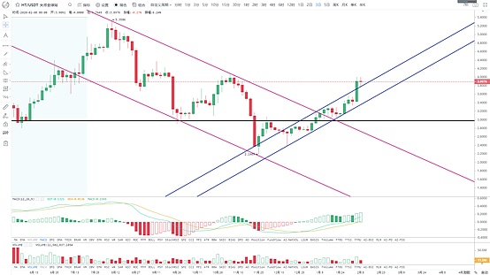 3日线级别,前几天大幅拉升突破这段时间以来的上升通道后,近期进行了回踩,回调缩量,MACD两线发散向上,仍为健康走势,后续大方向依旧看好,回踩可低吸为主,短期支撑3.75美元,压力4美元