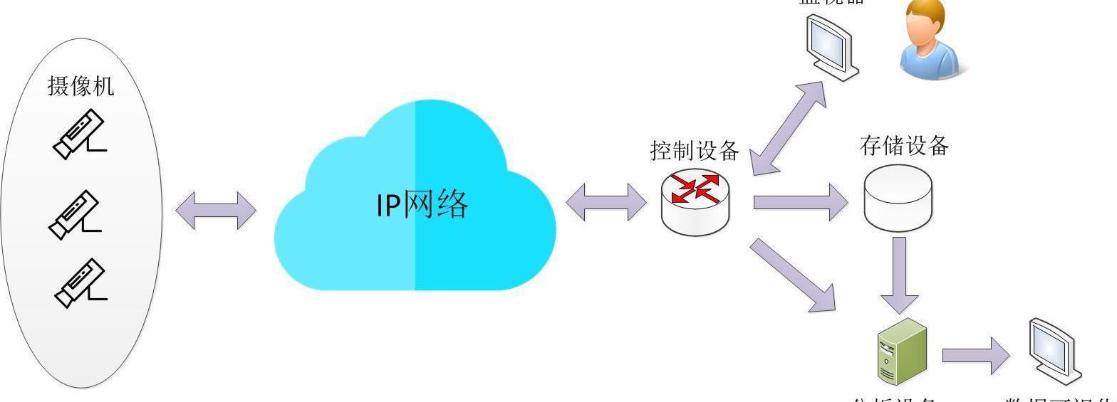 传统的网络视频监控系统是由摄像、传输、控制、显示和存储这五大部分组成。部署在各个监控点的摄像机通过IP网络将现场采集到的视频图像传输到控制设备,由控制设备再将视频分发到对应的监视器和存储设备。监控人员可以通过控制设备给摄像机发出指令,从而控制云台来调整摄像机上、下、左、右的角度以及对镜头进行调焦变倍等操作,也可通过控制设备实现在多路摄像机及云台之间进行切换。实时视频流可以分为三路,一路送给监视器,监视器除了显示各个监控点的实时画面外,还能接收并处理实时告警,比如异物闯入划定禁区等;第二路送入存储设备进行存储备份;第三路送入分析设备,该设备可以使用人工智能技术对视频内容进行分析,比如人体行为识别、人脸识别、车辆识别等;存储设备里的视频不但可以对视频进行回放、剪辑等操作,还可以对视频内容进行后期分析,比如人员/车辆轨迹分析等。