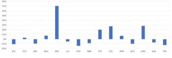值得注意的是,由于某些特质因素,BitcoinSV,LEO,ChainLink和Tezos具有显着正增长的表现。
